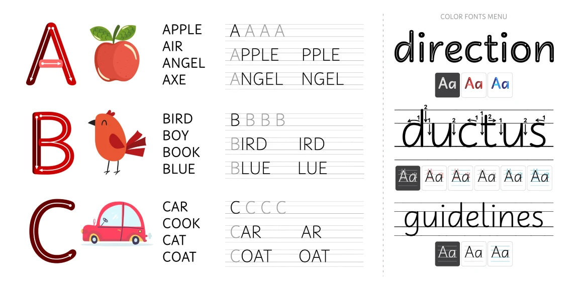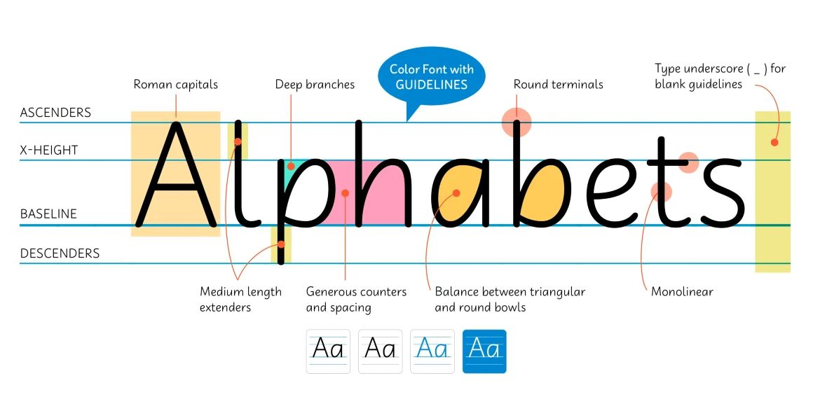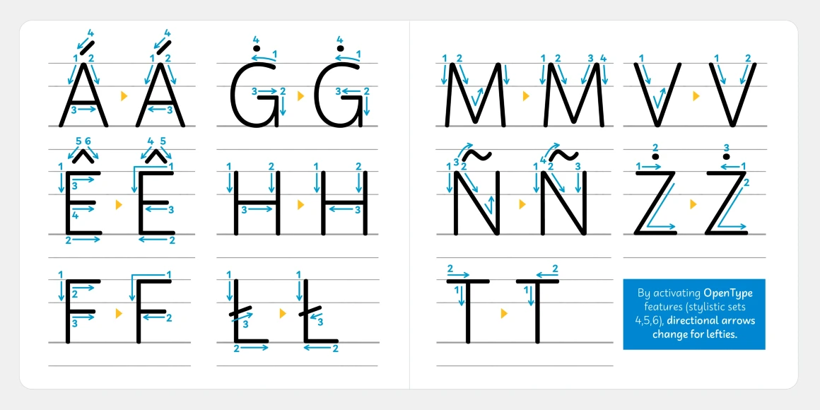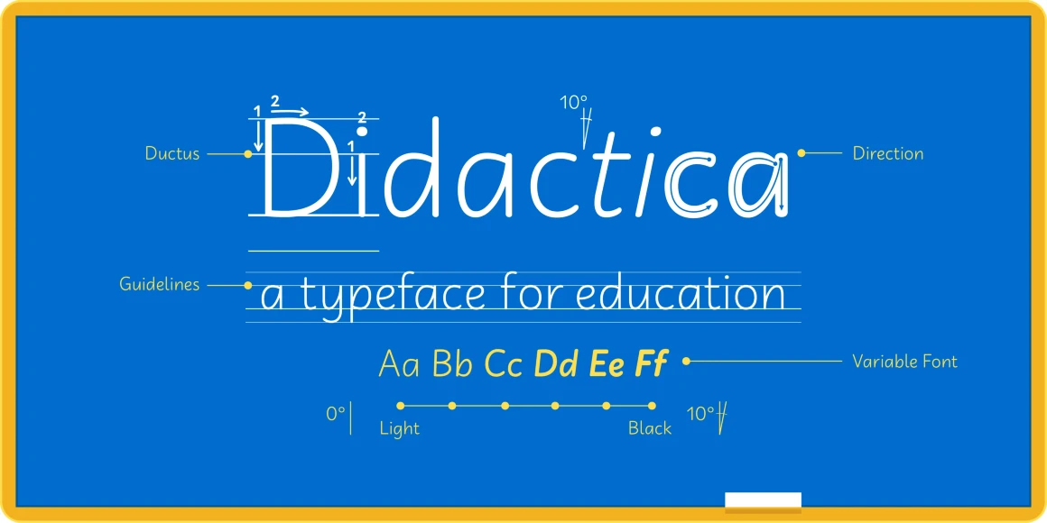 Didactica is a handwriting font family inspired by the lessons of Tom Gourdie. The idea was to create something familiar to kids and easy to read. It also features various styles for educational purposes, such as Direction, Ductus, and Guidelines — easily used as a handwriting instruction tool for children in their early years of schooling. Didactica is a friendly script perfect for books, toys, magazines, packaging, and educational materials.