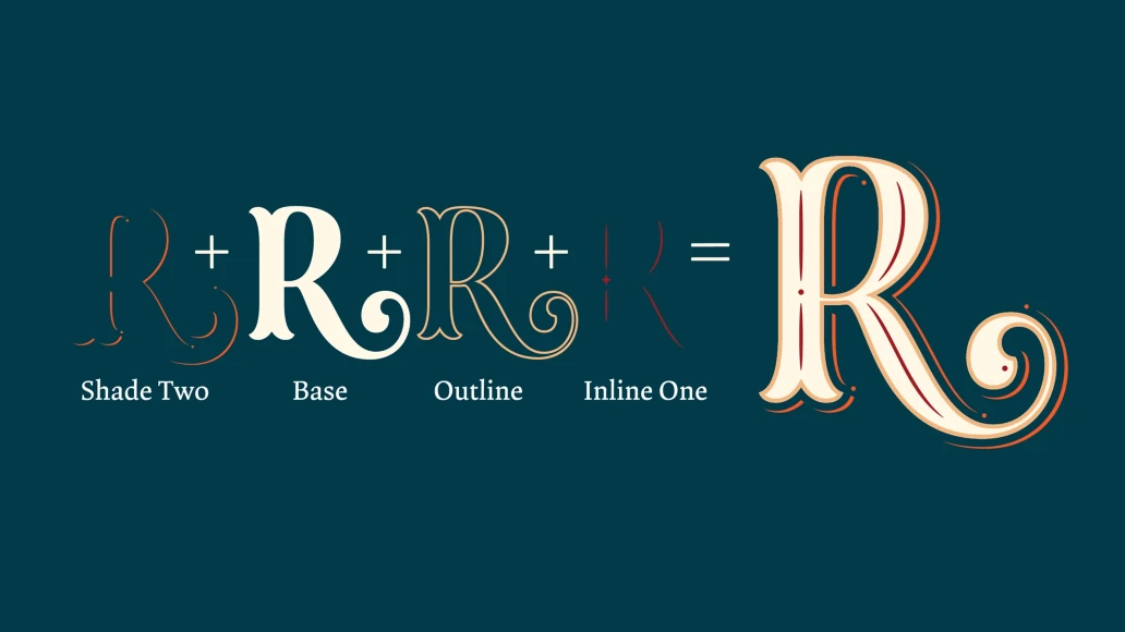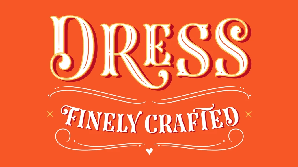 The main member of this family is the Base font which can be used alone or decorated with the layers: Shade One or Shade Two, Inline One or Inline Two and Outline. In this way, experienced designers will create their own combinations. On the other hand, there are multi-layered fonts that make Dress easier to use: Dress Combo One to Five. Additionally, Dress Deco adorns the beginning and the ending of the words, while the Ornaments decorates the whole design. The family package contains all this thirteen options.