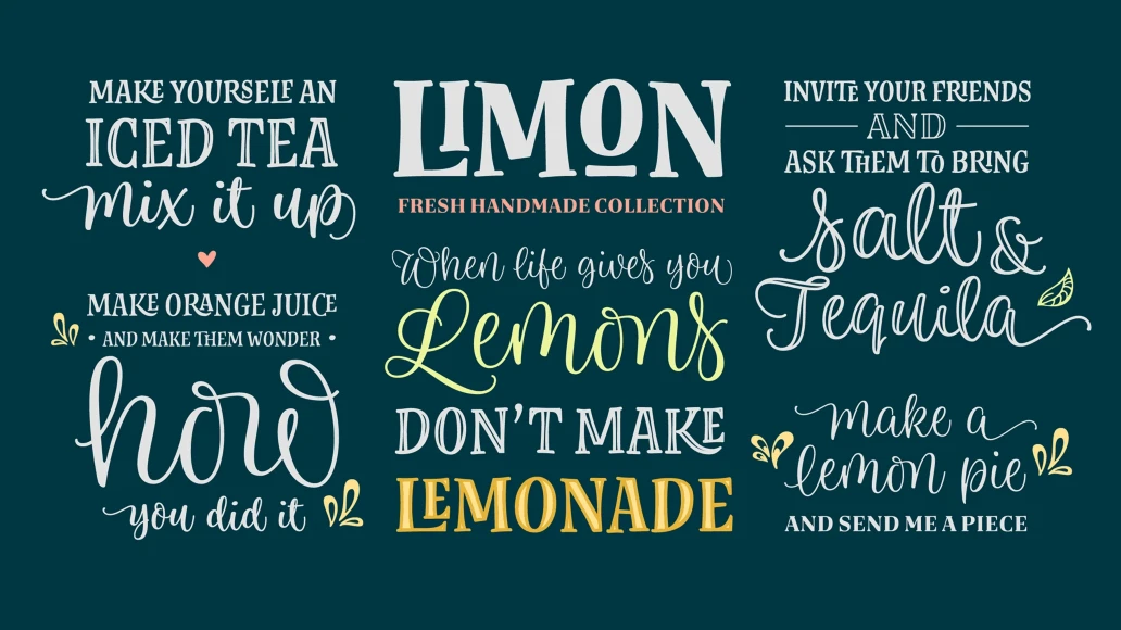 Limon was entirely hand drawn and carefully digitised to get accurate curves but keeping the handmade look. The script fonts are smart scripts, plenty of alternates designed to preserve the calligraphic rhythm. Limon is a beautiful option for menus, magazine covers, wedding invitations, cards and all kind of stationery, packaging and labels.