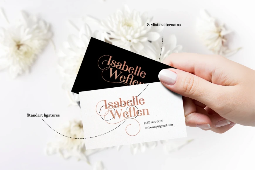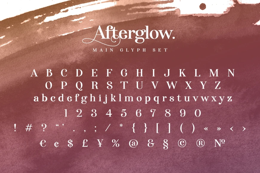 Afterglow is an elegant serif typeface with high contrast strokes and refined details. Features a wide range of stylistic alternates, including elegant swashes, with some letters offering up to 12 variations. Works beautifully in all-caps for headers and quotes, giving a strong and polished look. Combines well with lowercase for subheads and block text. Suited for art and beauty blogs, apparel, websites, posters, magazines, cards, and logos. Designed to be a go-to choice for stylish, expressive design.