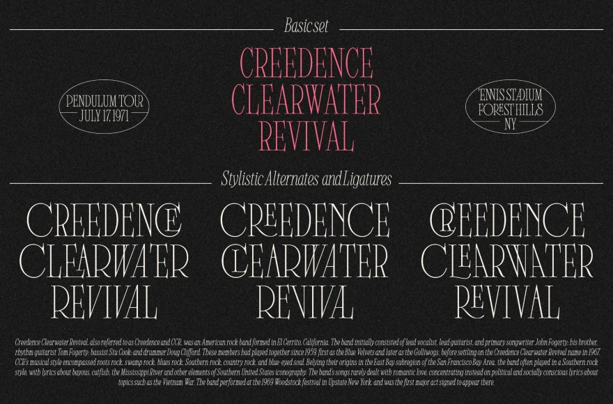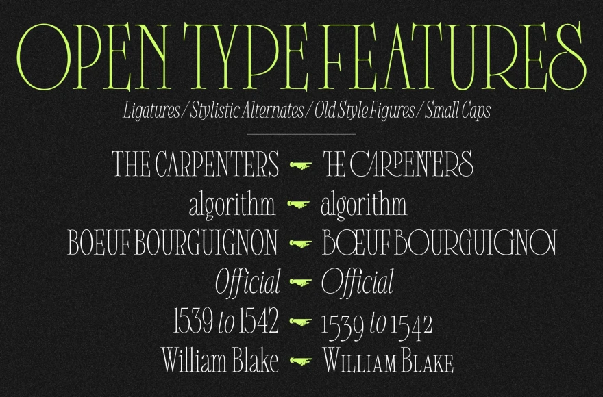Clementia is a stylish condensed serif font with a strong Art Deco influence. Features a wide range of stylistic alternates and ligatures for distinctive, custom looks. Adds elegance and character to cafe menus, wedding invitations, branding, magazine headers, t-shirt prints, and posters. Offers both refined simplicity with the basic set and expressive flair with decorative options. Designed for projects that seek a blend of vintage charm and artistic expression.