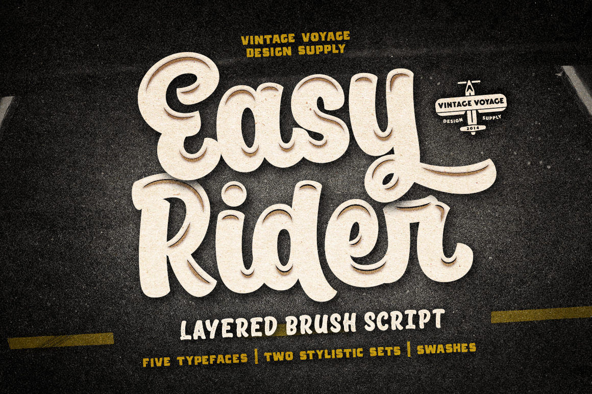 Easy Rider is a layered vintage brush script with a playful and energetic feel. Designed for branding, posters, packaging, and print projects. Offers three styles — clear, glare, and pressed — for both modern and retro looks. Ideal for creating expressive graphics with bold personality and handcrafted charm. Built to bring movement and character to any design.