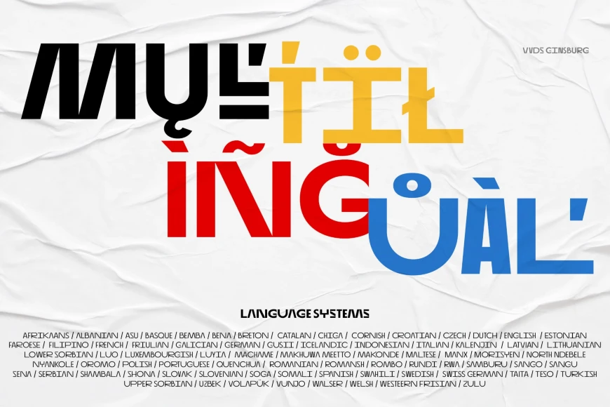 Ginsburg is a modern all-caps display font family built on geometric shapes and abstract wavy lines. Inspired by the architectural work of Moses Ginsburg and the spirit of old-school constructivism. Offers a balance between structure and playfulness, with alternate characters for added expression. Well-suited for headers, logos, block text, and bold statements. Ideal for TV series titles, podcast covers, exhibition posters, or modern sports brochures. Designed to be flexible, eye-catching, and full of attitude.