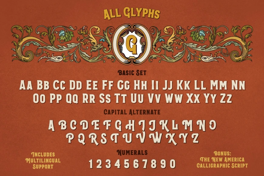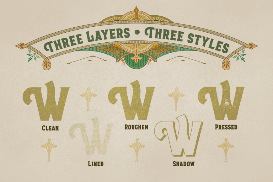 Golden Horn is a gently crafted typeface with a vintage touch. Offers multiple style variations for creating authentic retro designs. Pressed and rough styles bring a worn, classic look, while the clear and lined versions give a softer, refined feel. Using the basic set alone delivers a modern, clean appearance. Perfect for logos, packaging, posters, and any project needing a mix of vintage charm and contemporary style.