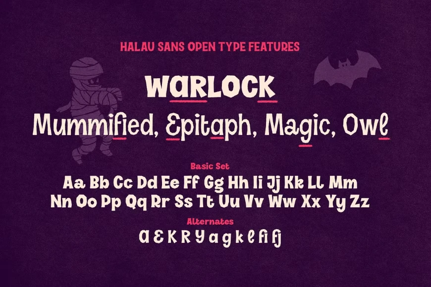 Vintage Voyage Design’s Halau Spooky Script is a creepily enchanting typeface for Halloween or other ghoulishly delightful events. It is meant for headlines, but because of its open shapes, it also works well at smaller subhead sizes! The various alternates within stylistic sets will completely satisfy the most sophisticated font gourmet, too. Choose Halau Spooky Script for party invitations, food packaging, theater posters, and anywhere else you might want something a little devilishly dark.