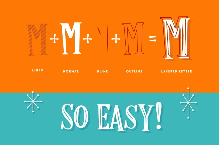 Retro Luxe is a layered font family inspired by postcards and advertising from the 1950s and early 1960s. Designed to bring a bold vintage flair to any project. Includes seven styles that can be combined for unique, eye-catching results. Use the Lined style for shadows or as a striking front layer. Choose from four inline variations and add an outline for decorative impact. Perfect for posters, signage, branding, and designs with a nostalgic touch. Made to stand out with a classic retro look.