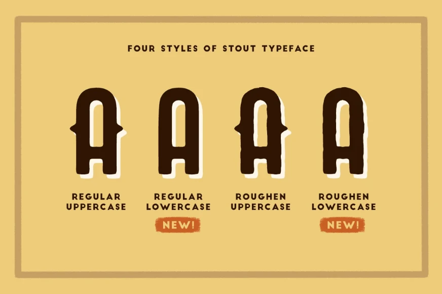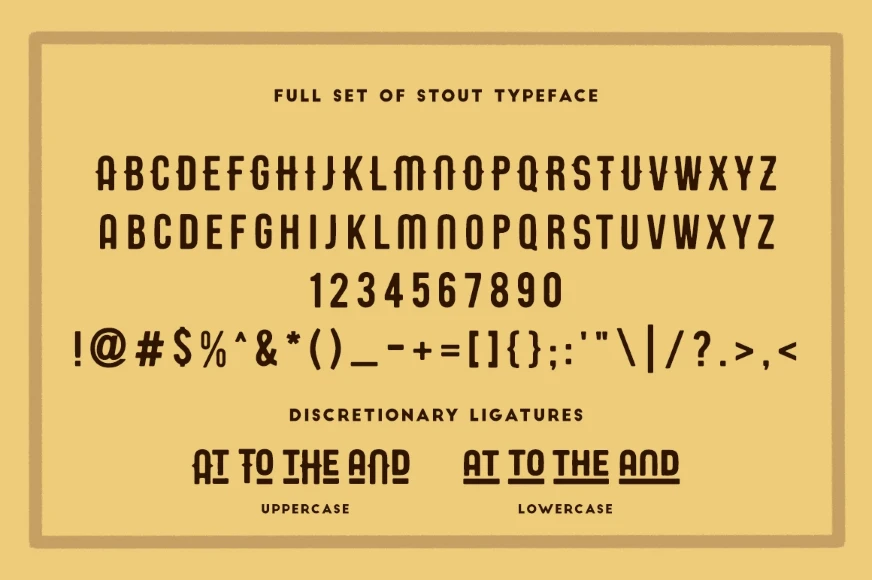 Stout is a bold vintage font designed for logos, headers, flyers, cards, posters, and more. Features letters, numbers, punctuation, and discretionary ligatures for added character. Comes in two styles — normal and handy — for versatile use. Built to bring a strong, classic look to any design with a handcrafted touch. Perfect for standout visuals with vintage charm.