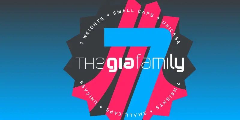 Gia is a family in seven weights with unicase options and true small caps, designed after the iconic letterforms of the first digital tech revolution of the 1960’s to 1980’s. These sinewy, curved letterforms popped up in logotypes and music videos and upright video games of the era: NASA, The Buggles, Atari, Pong, Sega, Namco, Stern, Devo, Apple. Gia pays homage to that letterform, and is named after Gia Carangi, the iconic face of early 1980’s pop fashion.