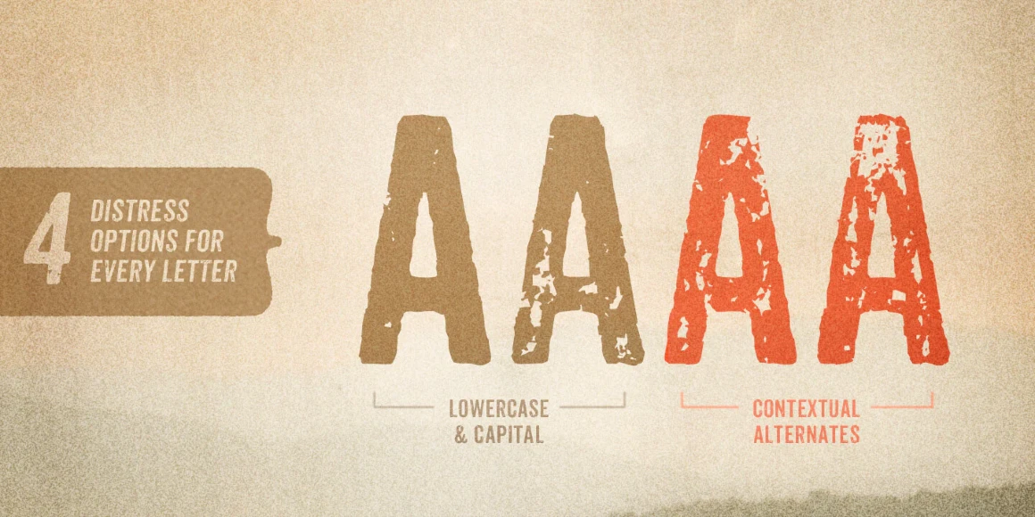 Anodyne is a warm and weathered all-caps font from Yellow Design Studio with hand-printed texture and unique shadow options. Features include four distress variations for each letter and at least two for every other character. Double-letter ligatures add realism by eliminating identical texture in adjacent characters. Layering regular and shadow versions allows independent control of the shadow color. Switch between lower-case and capital letters to change texture, or use opentype contextual alternates for additional, extra-distressed variations. Anodyne has an extended character set for multiple language support.