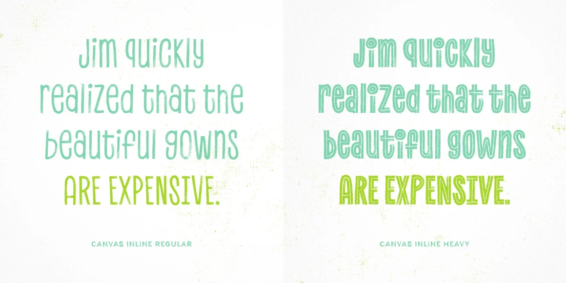 Canvas Inline is part of the Canvas Acrylic Megafamily. It’s an eccentric hand-painted unicase family with unique layering options. With authentic, hi-res texture it retains its realism even at very large sizes. Canvas Inline has double-letter ligatures that automatically fix adjacent duplicate letters. A bonus set of complimentary vector background textures, shapes and elements is available from the site.