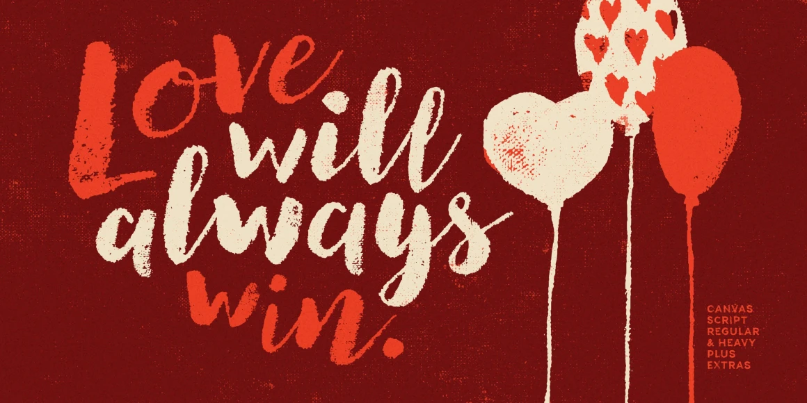 Canvas Script is part of the Canvas Acrylic Megafamily. It’s a festive set of acrylic brush fonts with regular, heavy, and layered versions. It features authentic, hi-res texture that retains its realism even at very large sizes. Canvas Script has double-letter ligatures that automatically fix adjacent duplicate letters. A bonus set of complimentary vector background textures, shapes and elements is available from the site.