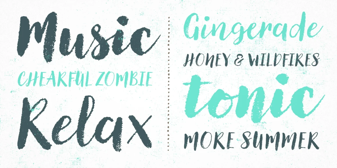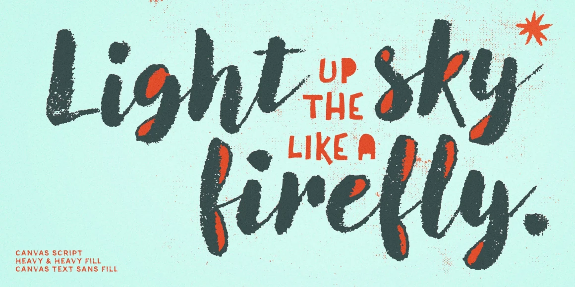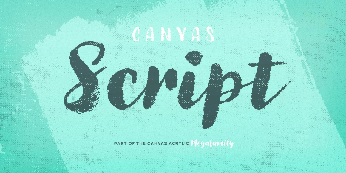 Canvas Script is part of the Canvas Acrylic Megafamily. It’s a festive set of acrylic brush fonts with regular, heavy, and layered versions. It features authentic, hi-res texture that retains its realism even at very large sizes. Canvas Script has double-letter ligatures that automatically fix adjacent duplicate letters. A bonus set of complimentary vector background textures, shapes and elements is available from the site.