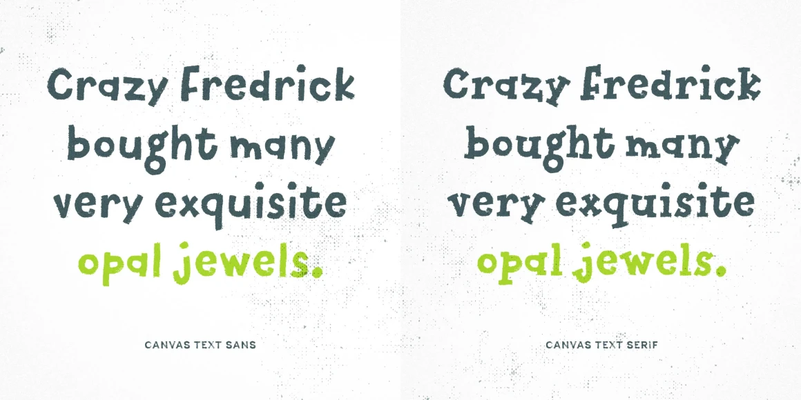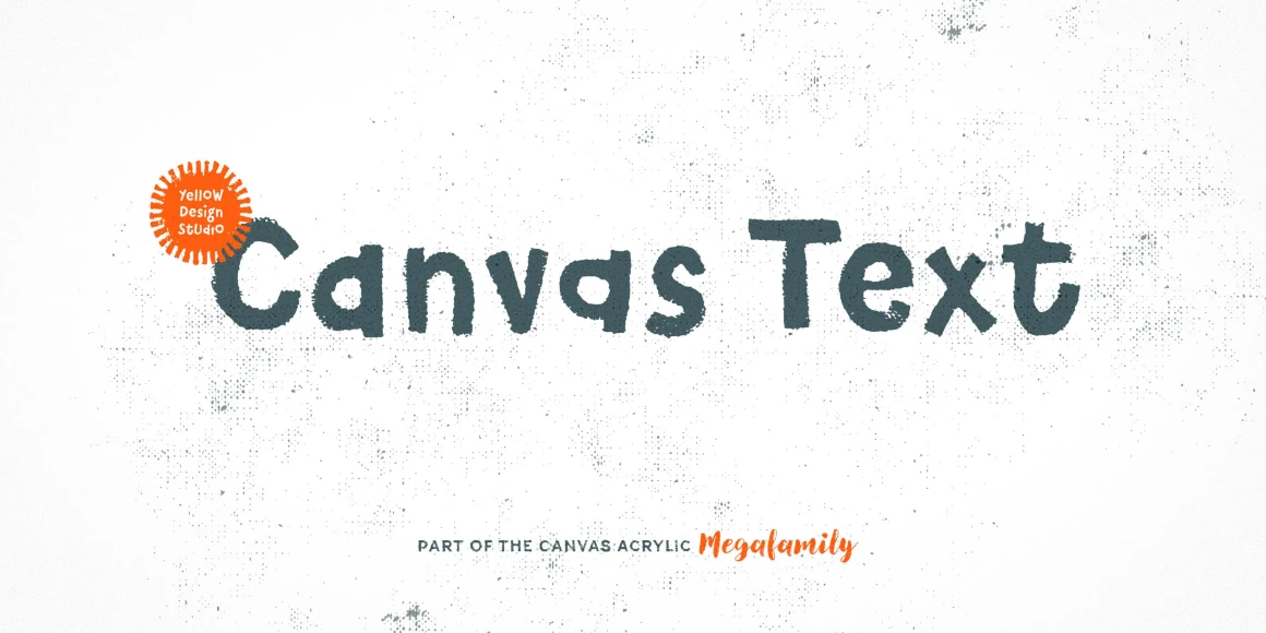 Canvas Text is part of the Canvas Acrylic Megafamily. It’s casual sans and serif with unique accent layers. It features authentic, hi-res texture that retains its realism even at very large sizes. Canvas Text has double-letter ligatures that automatically fix adjacent duplicate letters. A bonus set of complimentary vector background textures, shapes and elements is available from the site.