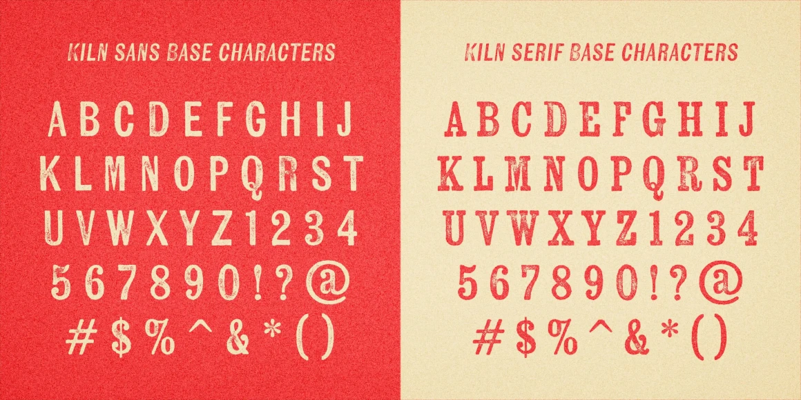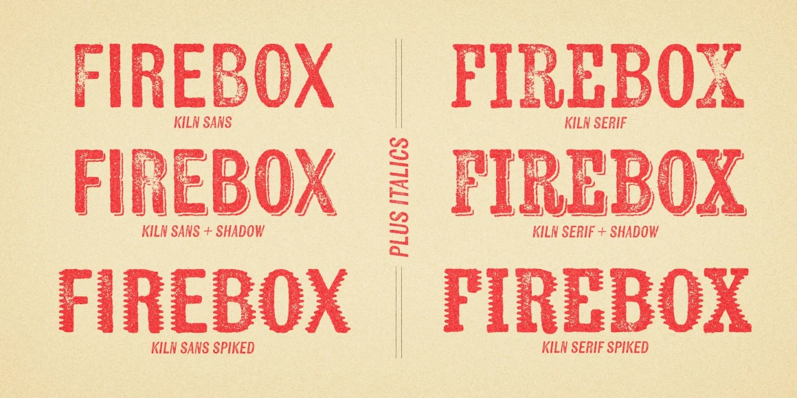 Kiln from Yellow Design Studio is a timeworn, hand-crafted type family with serif, sans serif, and unique spiked versions. It’s a historic revival with modern twists. All letters have 2 distress options for added realism and customization. Other features include shadow layers, automatic double-letter ligatures (to avoid adjacent letters with the same texture), italics, and multiple language support. Kiln has a high level of detail which looks authentic even at large sizes.