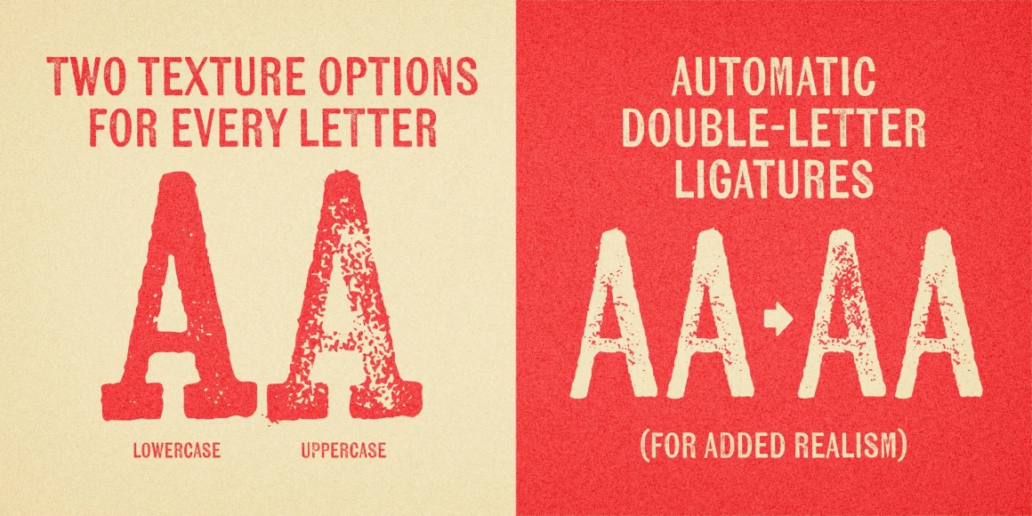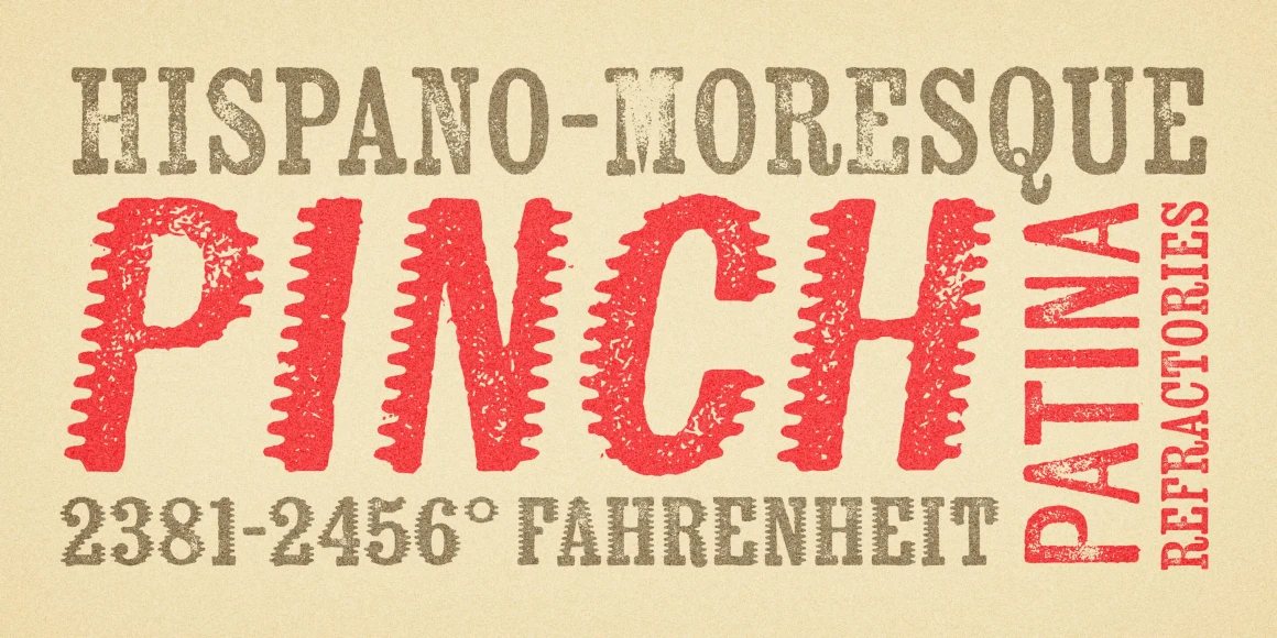 Kiln from Yellow Design Studio is a timeworn, hand-crafted type family with serif, sans serif, and unique spiked versions. It’s a historic revival with modern twists. All letters have 2 distress options for added realism and customization. Other features include shadow layers, automatic double-letter ligatures (to avoid adjacent letters with the same texture), italics, and multiple language support. Kiln has a high level of detail which looks authentic even at large sizes.