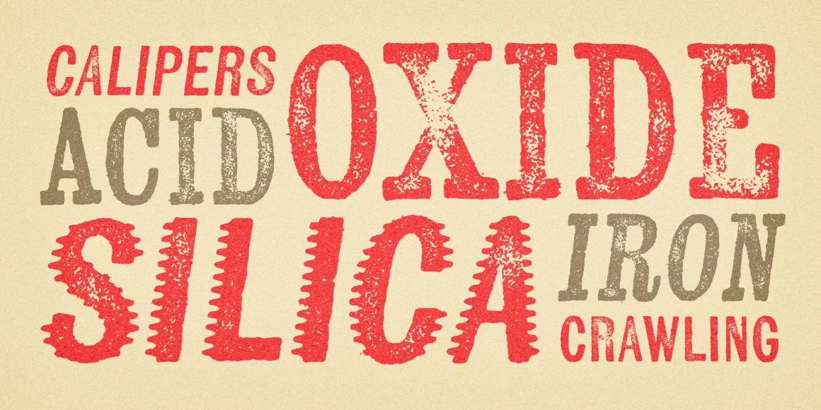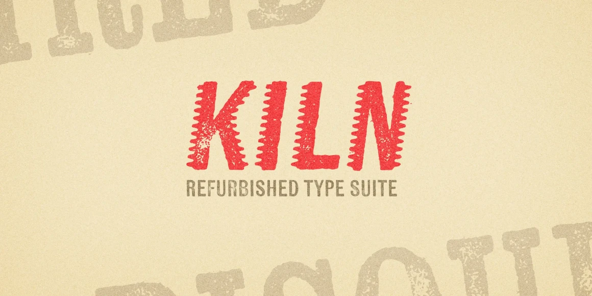 Kiln from Yellow Design Studio is a timeworn, hand-crafted type family with serif, sans serif, and unique spiked versions. It’s a historic revival with modern twists. All letters have 2 distress options for added realism and customization. Other features include shadow layers, automatic double-letter ligatures (to avoid adjacent letters with the same texture), italics, and multiple language support. Kiln has a high level of detail which looks authentic even at large sizes.