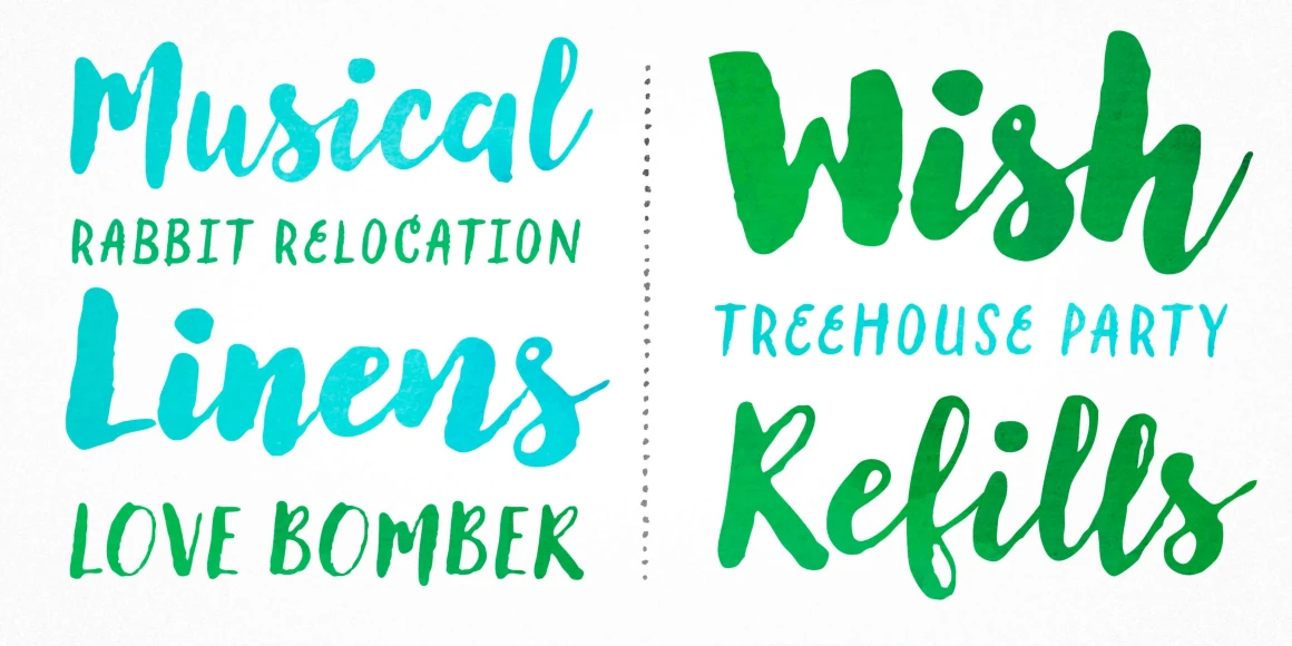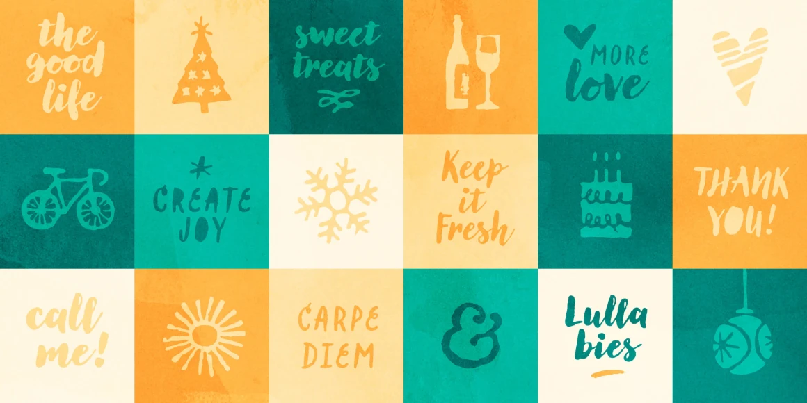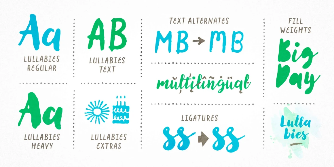 Lullabies from Yellow Design Studio is a warm-hearted brush font family featuring regular and heavy scripts plus a companion all-caps sans. Filled versions add extra playfulness. All weights include multiple options for every letter and number along with automatic double-letter ligatures for authentic hand-lettered typesettings. Also included is a set of 95 festive icons!