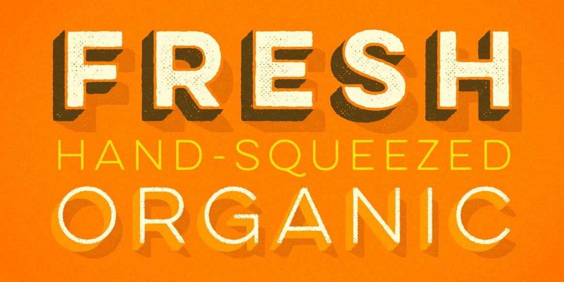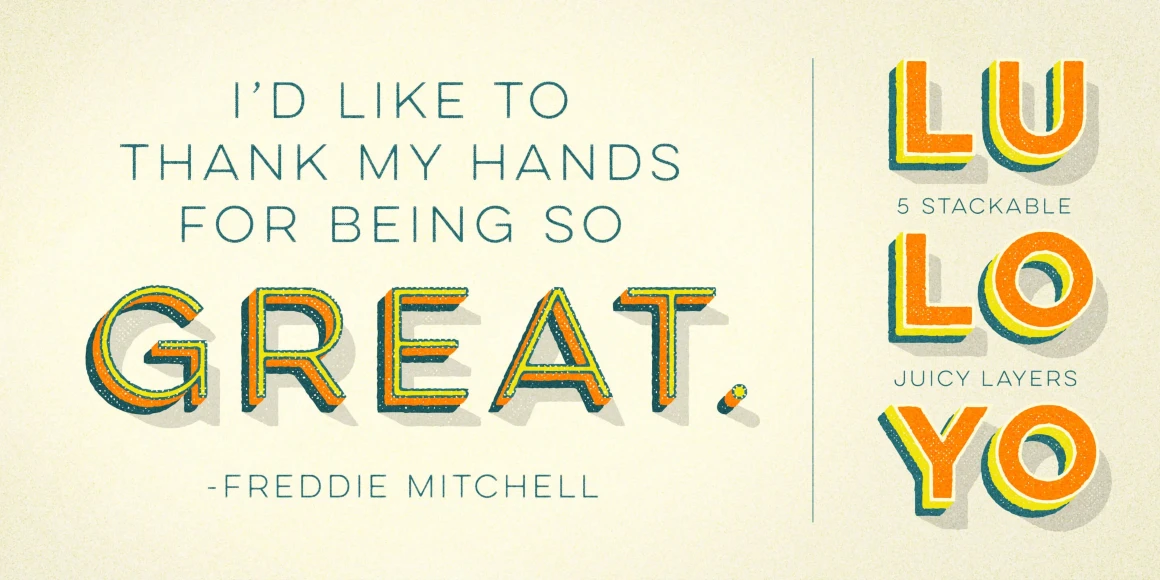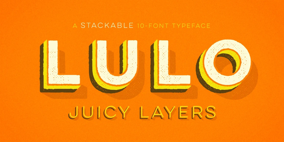 Lulo from Yellow Design Studio is a textured, retro, amazingly 3-dimensional font family. Lulo Clean is the non-distressed version of our original textured font family Lulo. Endless effects can be created by adding different colors to each of the 5 stackable layers. Lulo is all-caps, and has subtle texture variation between the upper and lowercase characters so duplicate distressing in double-letters can be avoided. Other features include regular and bold weights, high-resolution texture that looks great even at large sizes, and extensive language support.