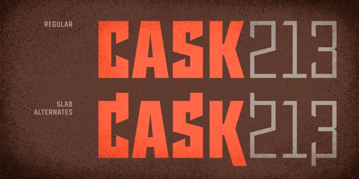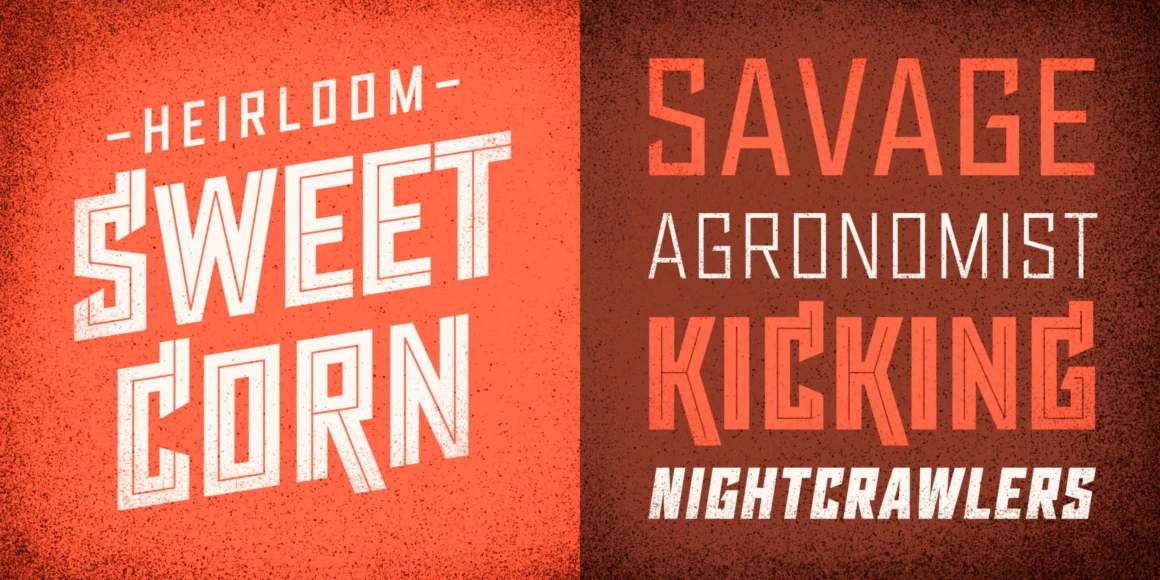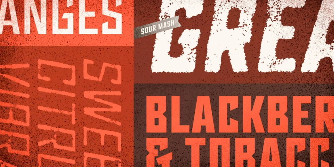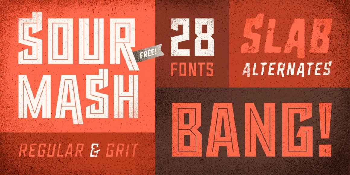 Sour Mash is a 28-font all-caps typeface distilled from geometric, industrial, and vintage letterforms. The regular versions are sharp and defiant, while “grit” versions add a bit of prohibitionist nostalgia. Features include slab alternates, professional typographic features, extensive language support, and double-letter ligatures to prevent duplicate texture in adjacent characters (for grit versions).